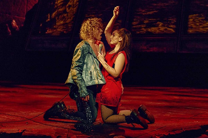 What I have to begin with is the staging… what a sight to behold! Each element of the staging has been considered to within an inch of its life. Each section of the set and each individual prop creates deeper meaning and connotations to the dystopian word we are thrust into. A building stretches up on stage right, which subtly symbolises the neck of a guitar. Next to this a crane, and below it a sewer pipe leading to the world of ‘The Lost’. Above this is a screen acting as a sort of billboard, which projects a live feed from a camera via an onstage cameraman, which portrays elements of the action on stage: a brilliant and interesting element of the production, which really added to the grungy 70’s rock music video feel.