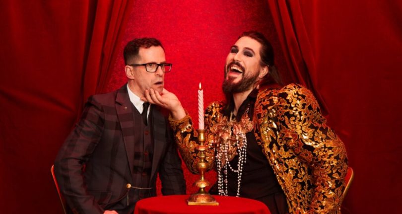 Perchard’s uneasy chemistry with composer and pianist Richard Thomas juxtaposes well with their easy command of the eager audience instantly won over by their unique mixture of sheepish charm and operatic bravado all bundled up in a scintillating gold trained over gown that can’t help but sparkle.