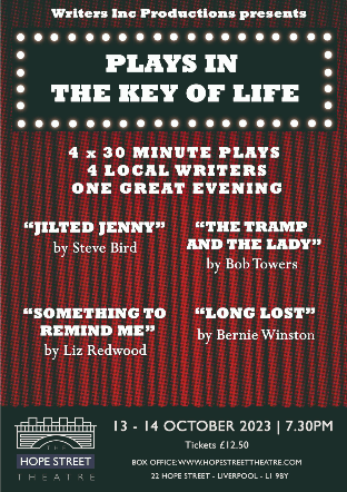 Plays in the Key of Life is an anthology of four short plays, presented by Writers Inc. Productions, a Liverpool based company founded by the four playwrights whose work is being presented. Each play has a different theme, but they are all united by explorations of loss, particularly loss caused by abandonment.