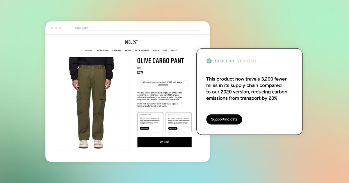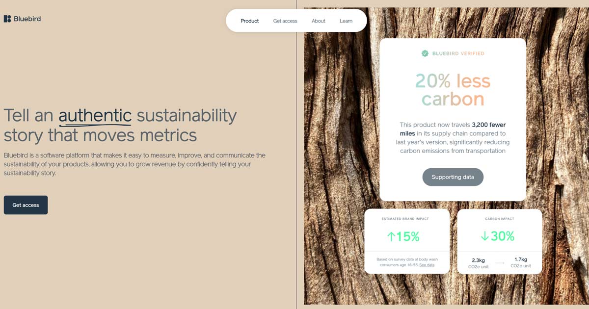 “Bluebird is a software platform that makes it easy to measure, improve, and communicate the sustainability of your products, allowing you to grow revenue by confidently telling your sustainability story.”