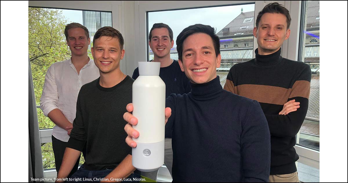 “We are all sparkling water lovers, but we [are] missing the opportunity to drink sparkling water on the go in an environmentally conscious way. For that reason, Christian signed up for a university course called ‘Lean Startup Academy’ and validated the idea with social media ads together with Nicolas. The feedback was awesome, and we decided to further work on the idea.”