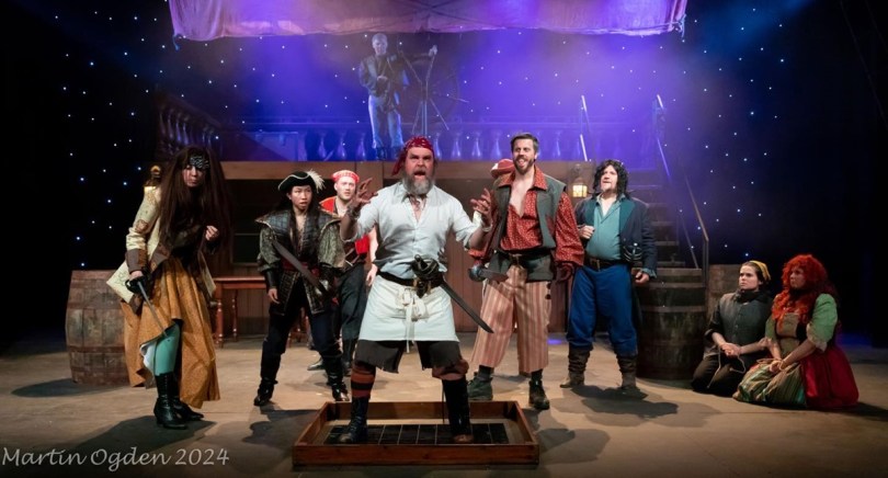 Joseph Meighan’s direction is competent, but several decisions have been taken which detract rather than enhance the evening’s entertainment. Lauren Brown’s Jim Hawkins is well acted but does not have the charisma to hold the attention of the audience. Michael Gallagher is a loud ebullient Long John Silver ably supported by an ensemble of pirates. Notable among these are Patti Linnett’s Joan the Goat and Jack So’s Israel Hands. The problems come when so many of the rest of the characters appear as caricatures of predictable tropes or imitations of well-known actors. The most notable of the latter being Helen Horridge’s performance of Squire Trelawny feeling like Dawn French doing pantomime and Euan Tanna-Fenton sounding like a young Griff Rhys-Jones in his Not The 9 O’clock News days. And while these parodies will go over the heads of younger audience members, they are not good enough to be effective for those old enough to remember the originals.
